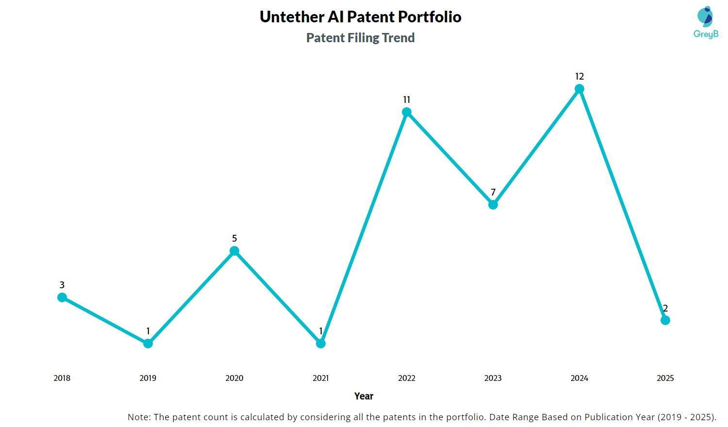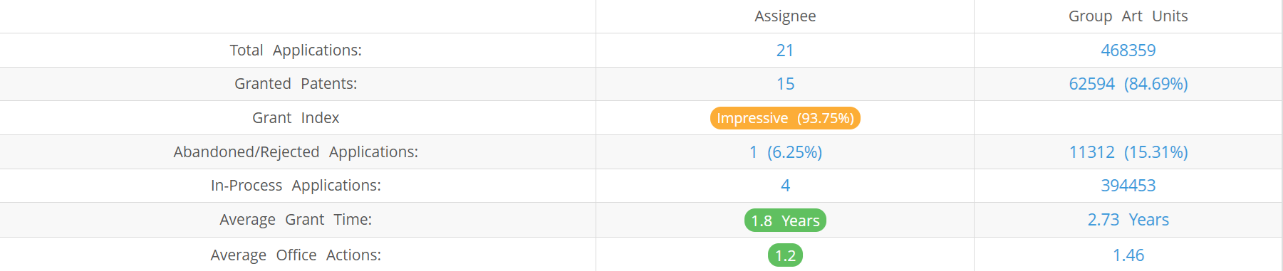 Untether AI (Excluding its subsidiaries) has filed 21 patent applications at USPTO so far (Excluding Design and PCT applications). Out of these 15 have been granted leading to a grant rate of 93.75%.
