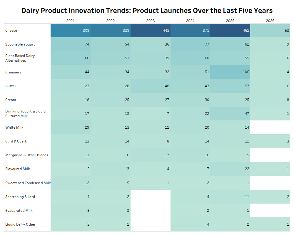 However, this innovation is not spread evenly across all dairy categories. Most new launches are concentrated in a few segments such as cheese, yogurt, creamers, and butter, while several other categories see limited activity. At the same time, dairy products are competing more directly with plant-based alternatives on the same shelves, making differentiation through formulation, claims, and product format more important than ever.