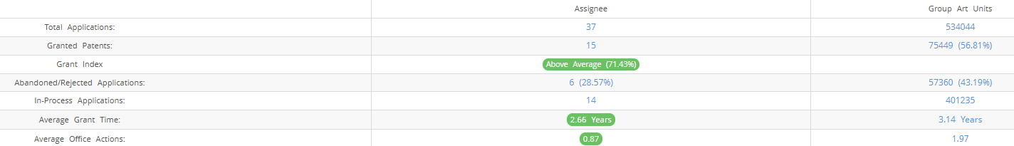 Viela Bio (Excluding its subsidiaries) has filed 37 patent applications at USPTO so far (Excluding Design and PCT applications). Out of these 15 have been granted leading to a grant rate of 71.43%.