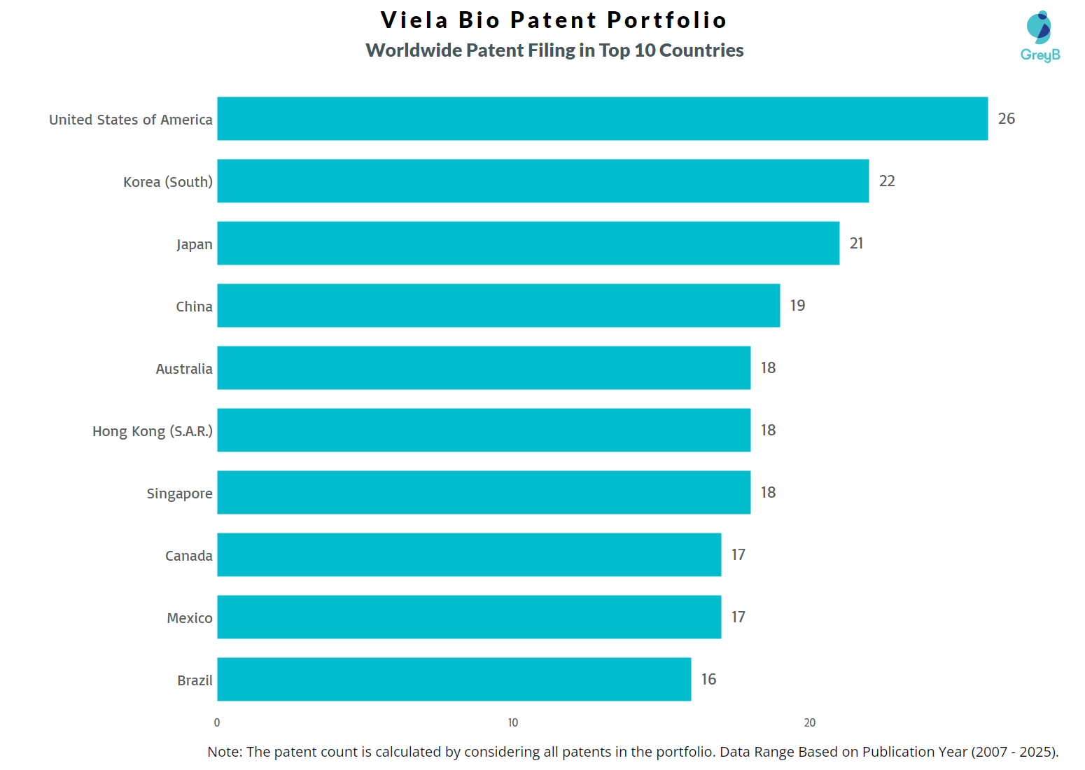 Viela Bio has a total of 319 patents globally, out of which 71 have been granted. Of these 319 patents, more than 91% patents are active. The United States of America is where Viela Bio has filed the maximum number of patents, followed by Korea (South) and Japan. Parallelly, United States of America seems to be the main focused R&D centre and also is the origin country of Viela Bio.