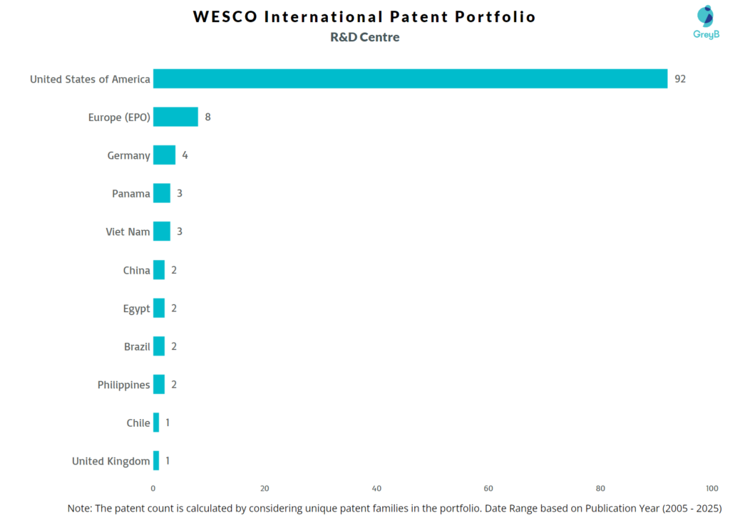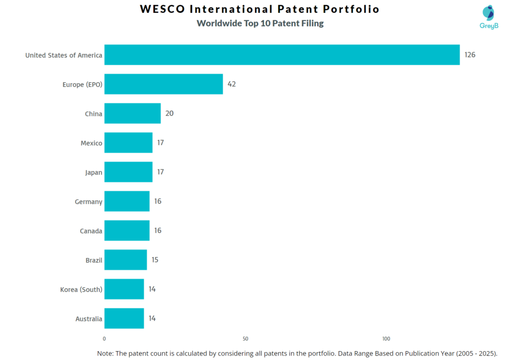WESCO International has a total of 503 patents globally, out of which 310 have been granted. Of these 503 patents, more than 46% patents are active. The United States of America is where WESCO International has filed the maximum number of patents, followed by Europe (EPO) and China. Parallelly, United States of America seems to be the main focused R&D centre and also is the origin country of WESCO International.