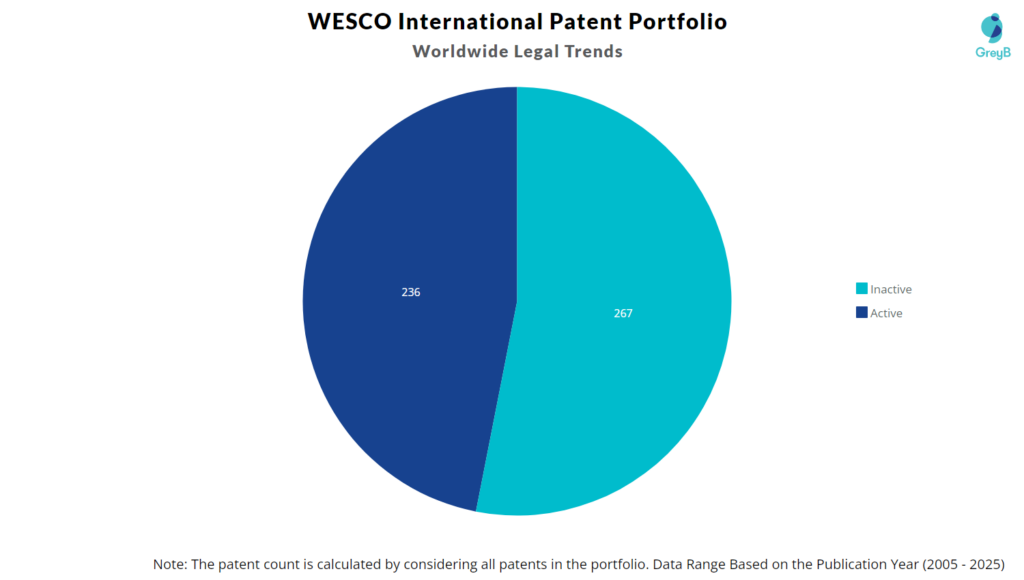 WESCO International has a total of 503 patents globally. These patents belong to 120 unique patent families. Out of 503 patents, 236 patents are active.