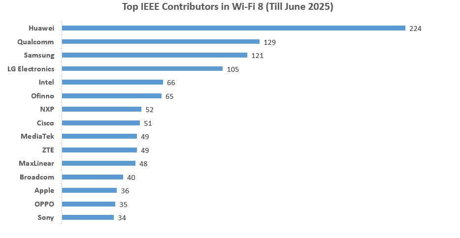 - Huawei, Qualcomm, and Samsung are the leading contributors to Wi-Fi 8. These companies are involved in nearly all the features, signifying their central role in shaping the technology.