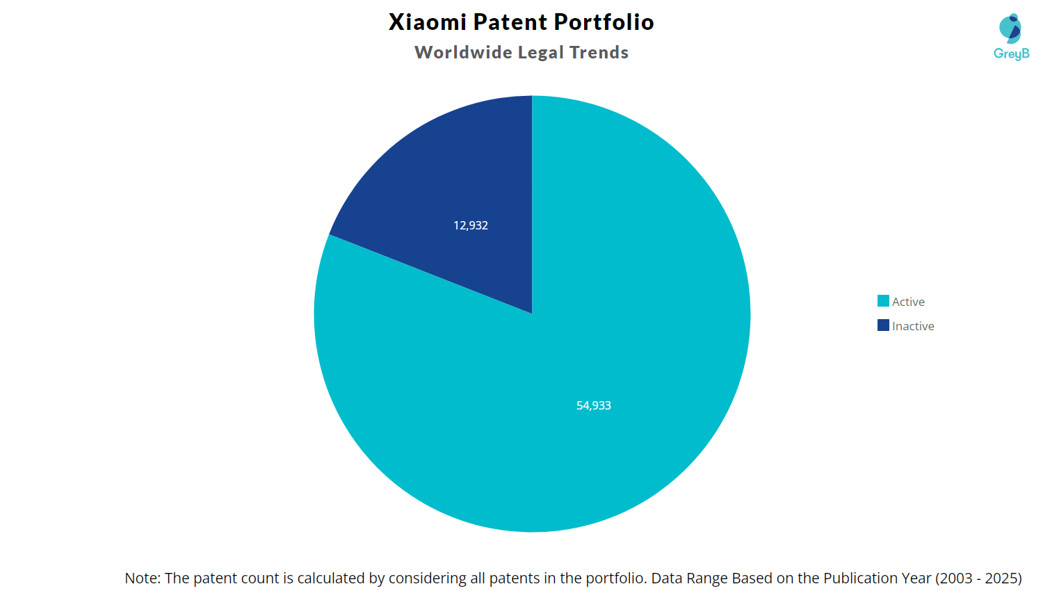 Xiaomi has a total of 67865 patents globally. These patents belong to 45713 unique patent families. Out of 67865 patents, 54933 patents are active.