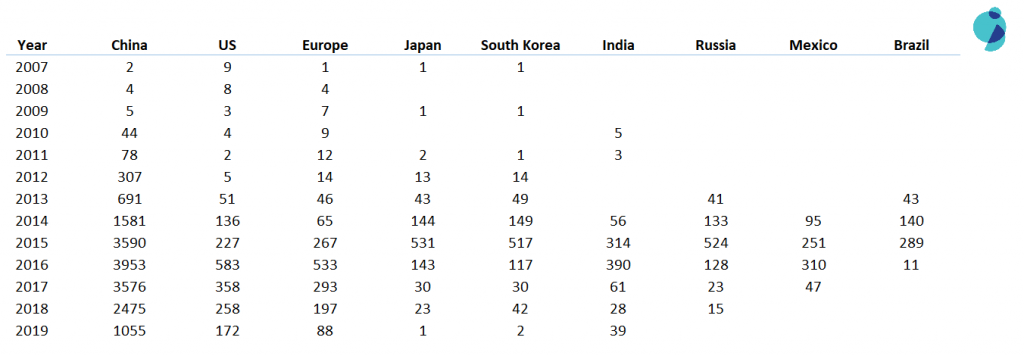 Are you wondering why there is a drop in patent filing for the last two years? It is because a patent application can take up to 18 months to get published. Certainly, it doesn’t suggest a decrease in the patent filing.