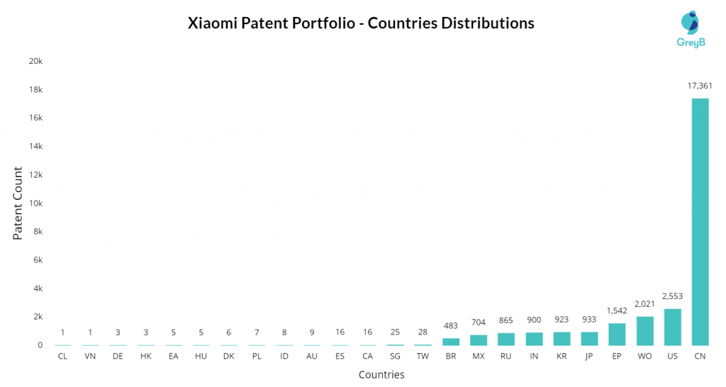 Xiaomi has a total of 67865 patents globally, out of which 29688 have been granted. Of these 67865 patents, more than 81% patents are active. China is where Xiaomi has filed the maximum number of patents, followed by the United States of America and Europe (EPO). Parallelly, China seems to be the main focused R&D centre and also is the origin country of Xiaomi.