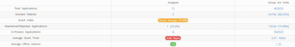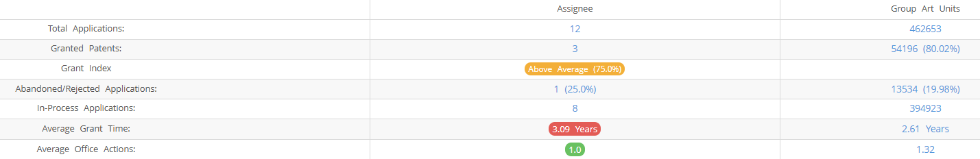 Yank Technologies (Excluding its subsidiaries) has filed 12 patent applications at USPTO so far (Excluding Design and PCT applications). Out of these 3 have been granted leading to a grant rate of 75%.