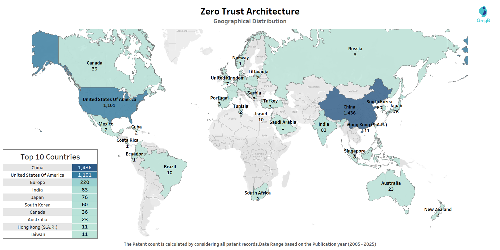 This chart shows where companies and organizations are filing Zero Trust patents worldwide from 2004 to 2025. China leads significantly with 1,436 patent filings, followed by the United States with 1,101 filings. Europe collectively shows 220 filings, while India (83), Japan (76), and South Korea (60) round out the top tier. This distribution reveals which countries view Zero Trust technology as strategically important and are actively protecting their innovations through patent systems.