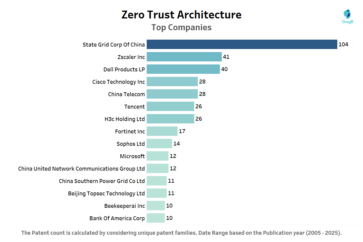 Did you know State Grid Corp of China leads the pack with 104 patents, more than double anyone else. Zscaler Inc. follows with 41 patents and Dell Products LP with 40. These numbers show who is investing the most in Zero Trust innovation.