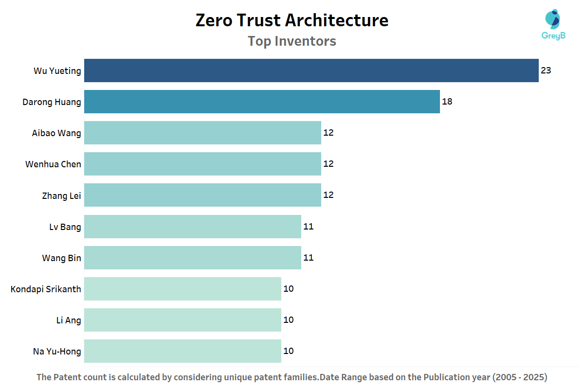 This table shows the most active inventors in Zero Trust security, listing their names, affiliated organizations, and the number of patents they have contributed. Wu Yueting from Tencent leads with 23 patents, followed by Darong Huang from Anhui University with 18 patents, highlighting the key individuals driving innovation in this field.