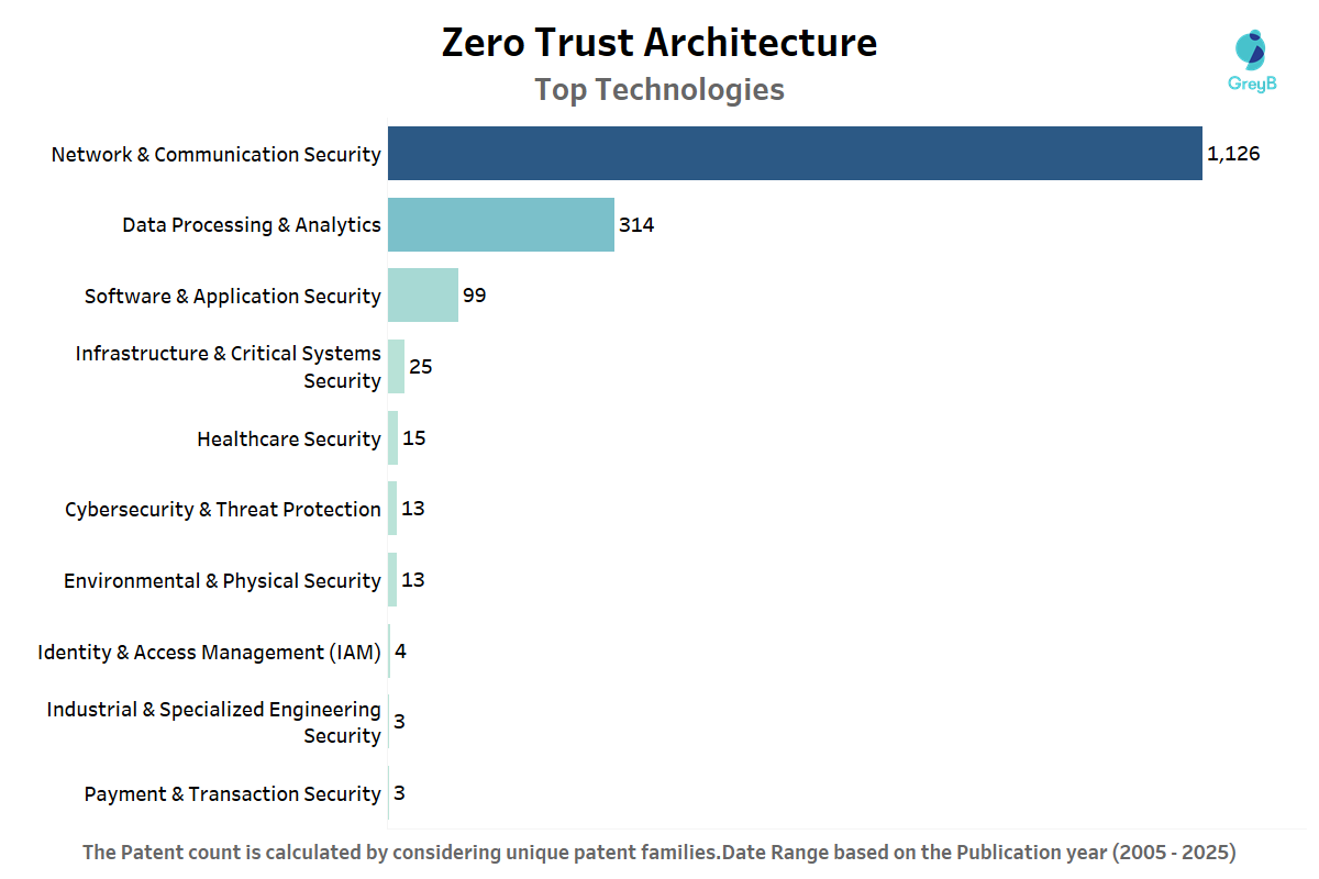 The patent landscape in Zero Trust Architecture shows a clear focus on securing how systems communicate. Network & Communication Security leads by a wide margin with 1,126 patents, showing that most innovation is happening around protecting data as it moves across devices, users, and networks.