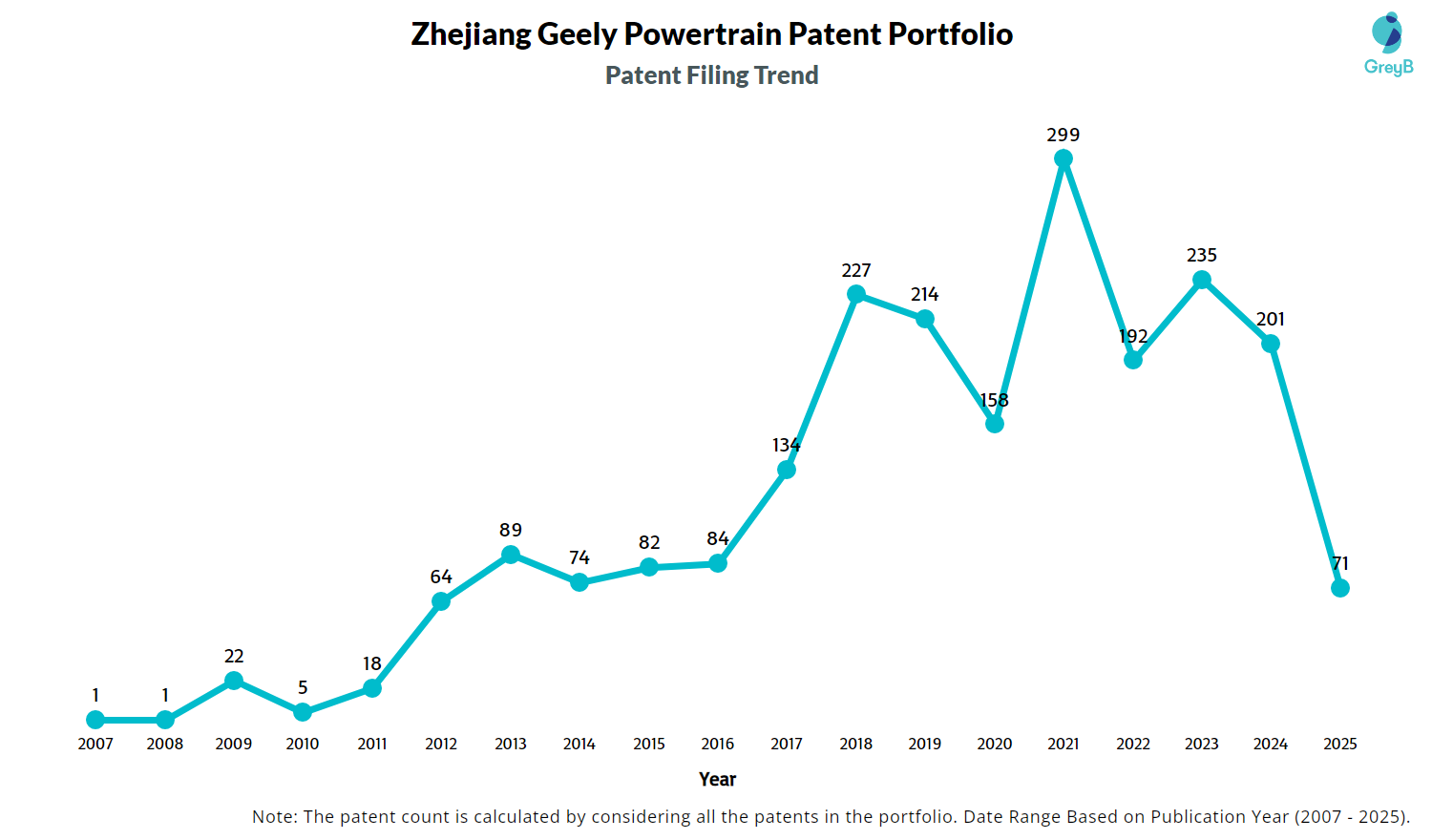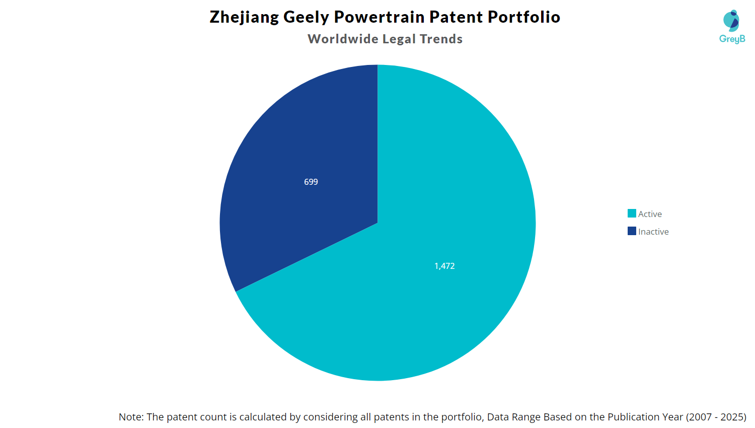 Zhejiang Geely Powertrain has a total of 2171 patents globally. These patents belong to 1975 unique patent families. Out of 2171 patents, 1472 patents are active.